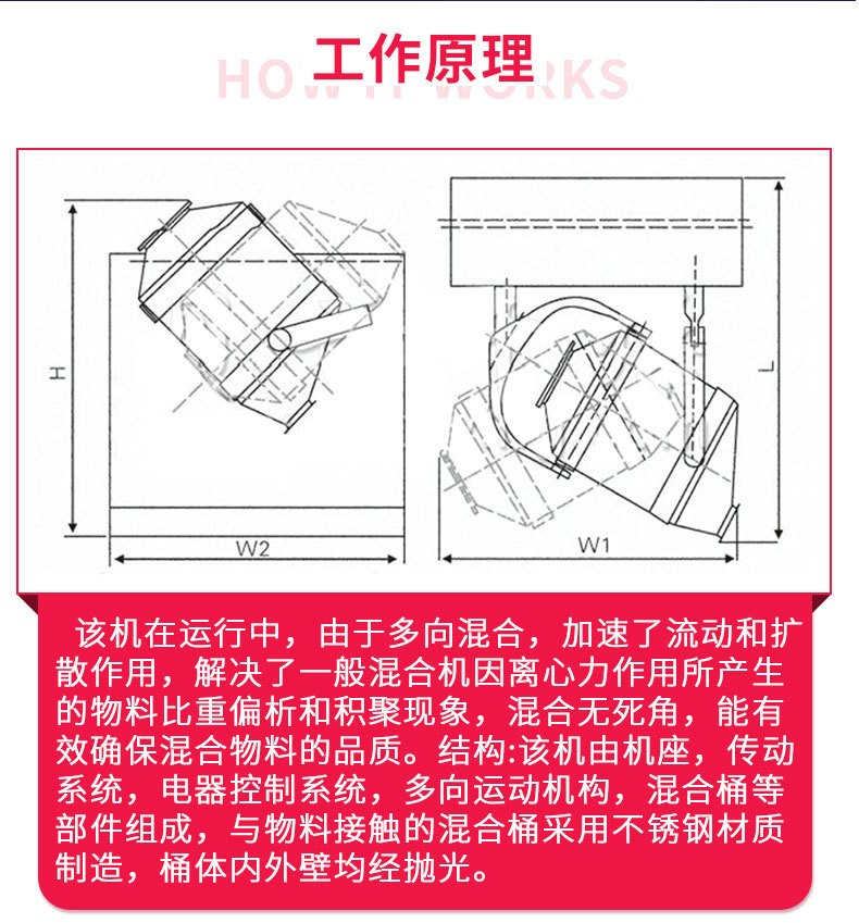 · 三维混合机的混合筒多方向运动,物料无离心力作用,无比重偏析及分层、积聚现象,各组分可有悬殊的重量比,混合率达99.9%以上,是各种混合机中的一种较理想产品。